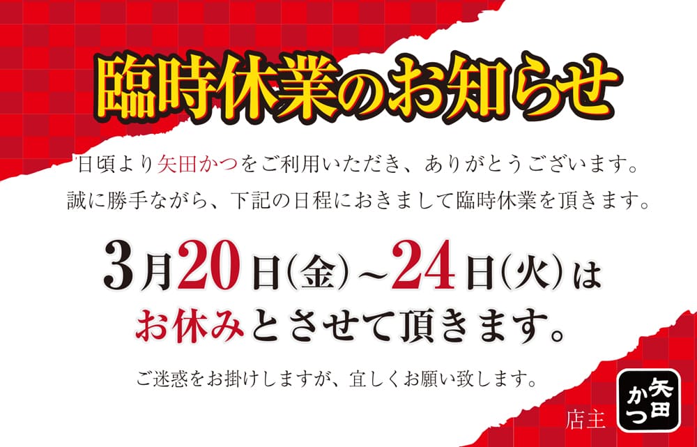 投稿日: 2026年2月24日臨時休業のお知らせ いつも矢田かつをご利用いただき、誠にありがとうございます。 誠に勝手ながら、下記の日程を臨時休業とさせて頂きます。 3月20日(金)〜24日(火)までお休みとさせて頂きます。 ご迷惑をお掛けしますが、宜しくお願い致します。